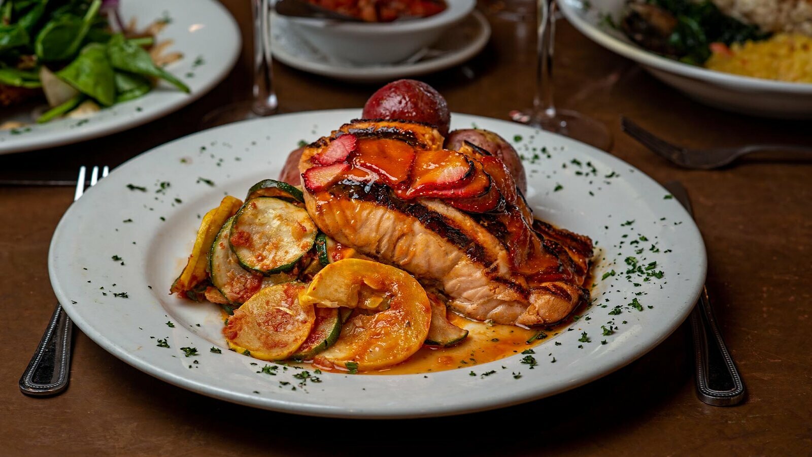 A grilled Salmon filet glazed with a spicy strawberry-orange infused BBQ sauce. Served with sauteed zucchini & rosemary potatoes.